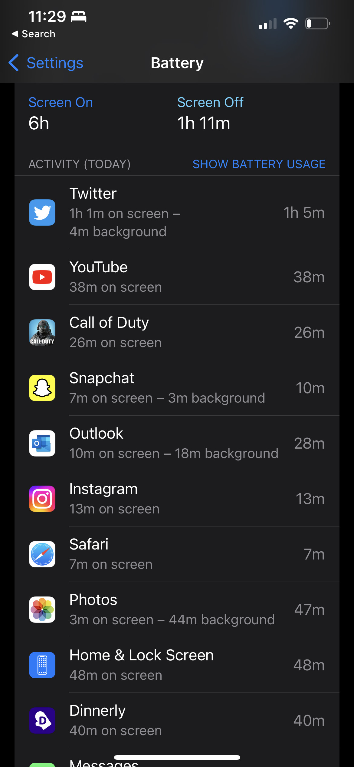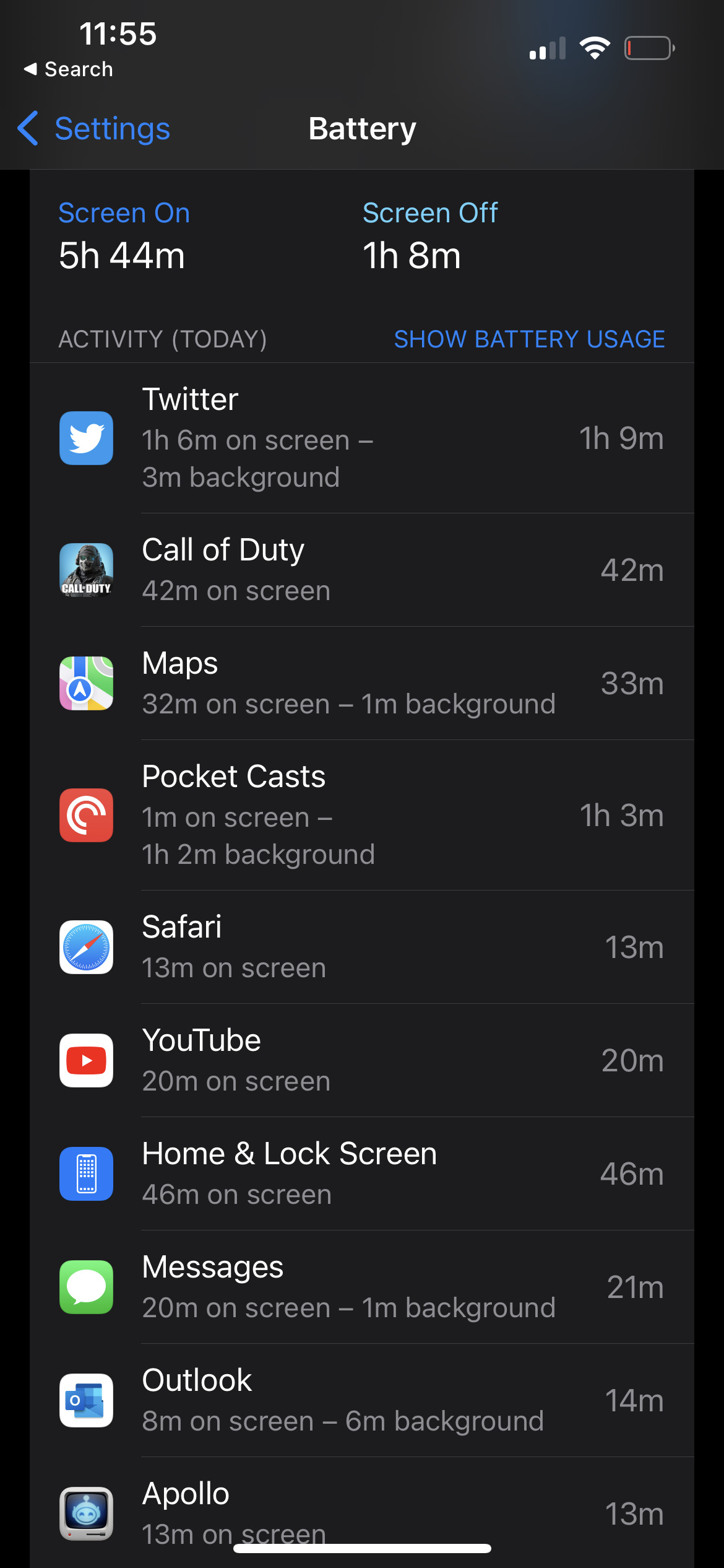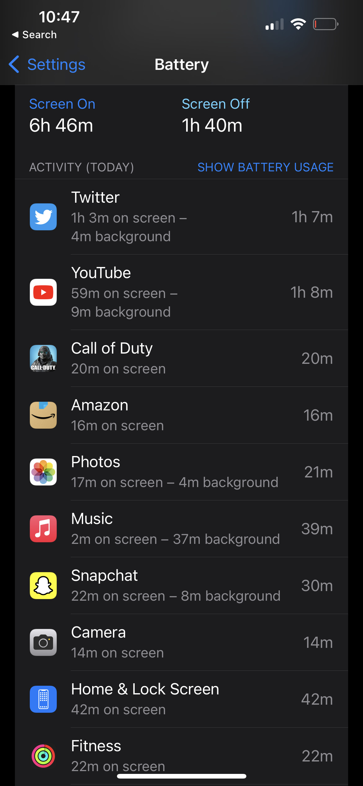 Here’s what a typical day with the iPhone 14 has looked like for me, I’ll watch about an hour of YouTube, play 30-ish minutes of Call of Duty: Mobile, and regularly use countless other apps like Twitter, Safari, Microsoft Teams, Outlook, Apple Music, and more throughout the day. After over 14 hours of uptime with over 5.5 hours of screen-on time, I have about 25% battery life left in the tank.