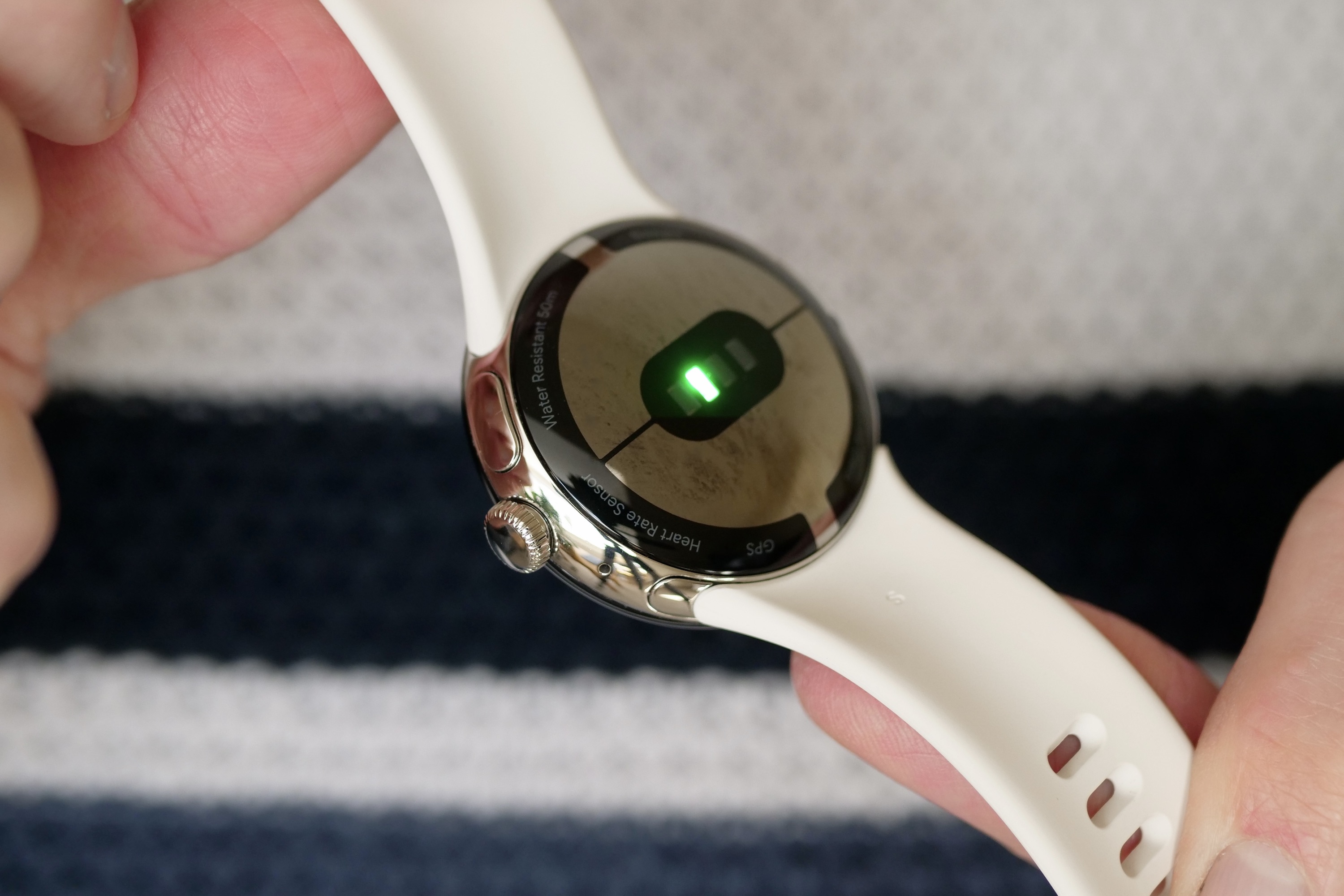 It’s attached using a proprietary system, where you press a tiny button on the case and slide the strap to the side to remove it. It’s a bit awkward to do, and putting it back on requires more precision than you may expect. It does feel very secure, but like the Apple Watch, it means you can’t use normal watch straps — only those specially made with Google’s system.