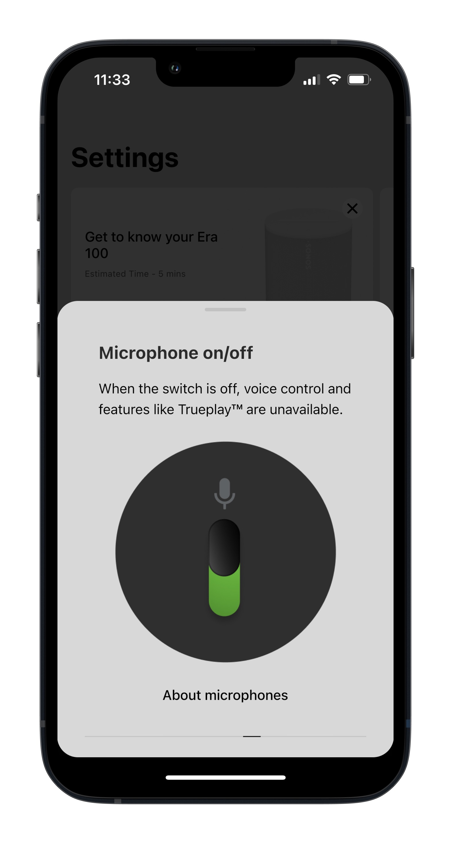 When in use, the microphone array does a good job of responding to voice commands as long as the Era 100 is the only source of music in the room. If you happen to have a different sound system going (like a kitchen TV) it can sometimes struggle. At the time of my review, Alexa wasn’t fully functional on the Era 100, but Sonos Voice Control worked without a hitch.